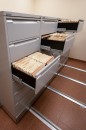 Разработали индивидуальный проект расстановки стеллажей. Установили мобильное основание на уже имеющиеся у клиента картотеки и добавили новые. Неровности пола скорректировали установкой фальшпола.