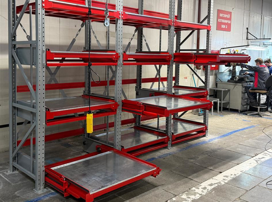Вариант стеллажей для хранения тяжелой запорной, регулирующей и предохранительной арматуры, с полным или частичным выдвижением полок и механизмом защиты. При потребности комплектуются талью, защитными дугами и цепями.