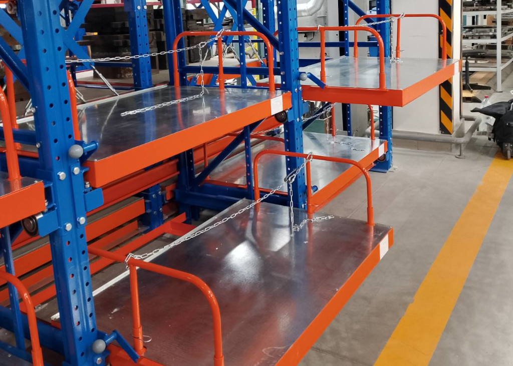 Стеллажи для тяжелых фланцев с полками полного или частичного выдвижения и механизмом безопасности. Могут комплектоваться талью и специальным покрытием полок для предотвращения повреждения деталей.