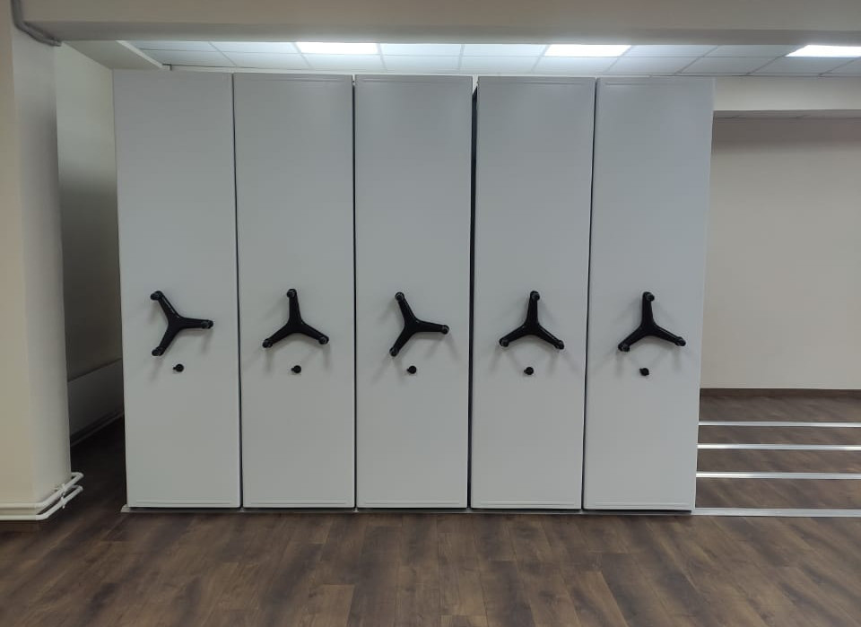 Архивные стеллажи передвигаются по системе рельс. В зависимости от состояния полов выбирается система с фальшполом или без. Привод мобильных стеллажей механический (от штурвала) или электронный (управление с кнопочной панели, сенсорного экран, стационарного или переносного компьютера).